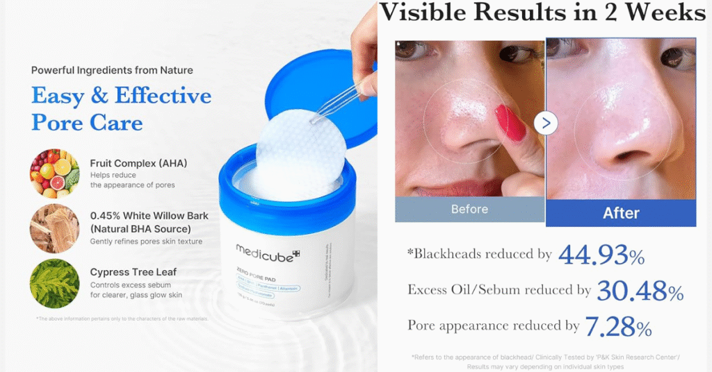 Keywords: Medicube Zero Pore Pads 2.0, dual-textured facial toner pads, exfoliation, pore care, AHA Lactic Acid, BHA Salicylic Acid, sensitive skin, Korean skincare, K-beauty, pore tightening, acne care, blackhead removal, skin texture improvement, dual-sided pads, Medicube toner pads.